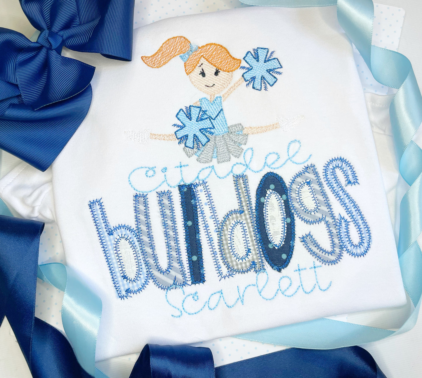 Please list team name for applique...cheerleader skin color and hair color....and team colors in the NOTES section of your cart.